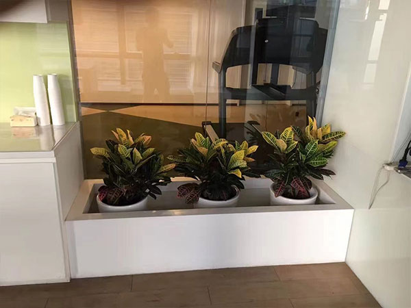 前臺是一家中心的門面,所以擺放的植物要求具一定的檔次??梢赃x擇在前臺側(cè)邊位置擺放一些枝葉比較茂盛的品種,寓意中心蓬勃生機(jī)。中心臺面可以選擇擺放一盆紅掌、粉掌或蝴蝶蘭盆栽,這幾類植物都是時令花卉,鮮花比較醒目給人感覺比較紅火。